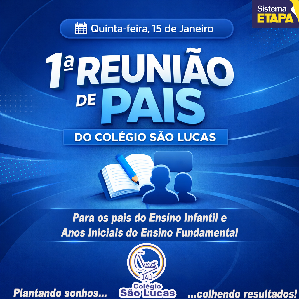 Na quinta-feira, 15 de janeiro, às 19h, esperamos você nas dependências do Colégio São Lucas para a nossa 1ª Reunião de Pais dos Ensinos Infantil e Anos Iniciais do Fundamental (1º Ano ao 5º Ano).